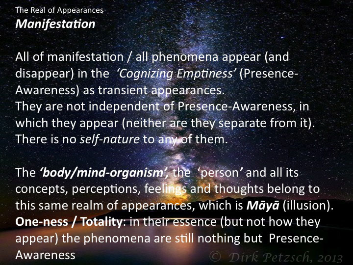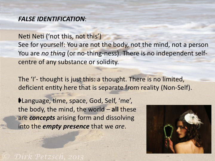 So here is another side to this: If we are THAT (Presence-Awareness), the exclusive identification with ‘any-thing’ less than that (‘the person’, ‘the so-and-so character’) necessarily must be erroneous.